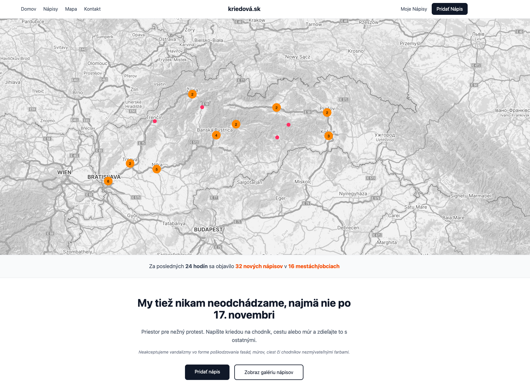 kriedová.sk je komunitní webová aplikace pro mapování a archivaci křídových nápisů na chodnících po celém Slovensku. Uživatelé mohou nápis vyfotit, označit jeho polohu a přidat do veřejné galerie. Projekt zachycuje kreativní a občanské projevy ve veřejném prostoru, umožňuje je objevovat v interaktivní mapě a tvoří digitální archiv jinak rychle mizících nápisů.