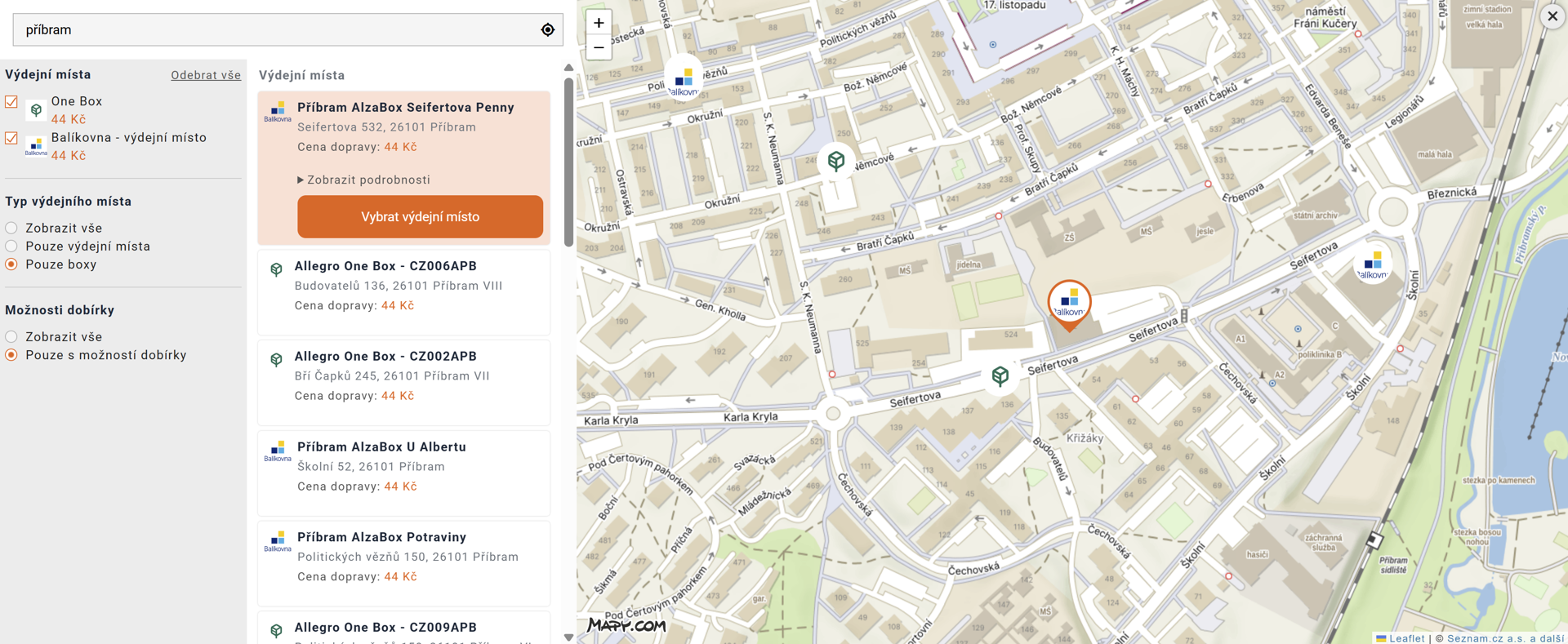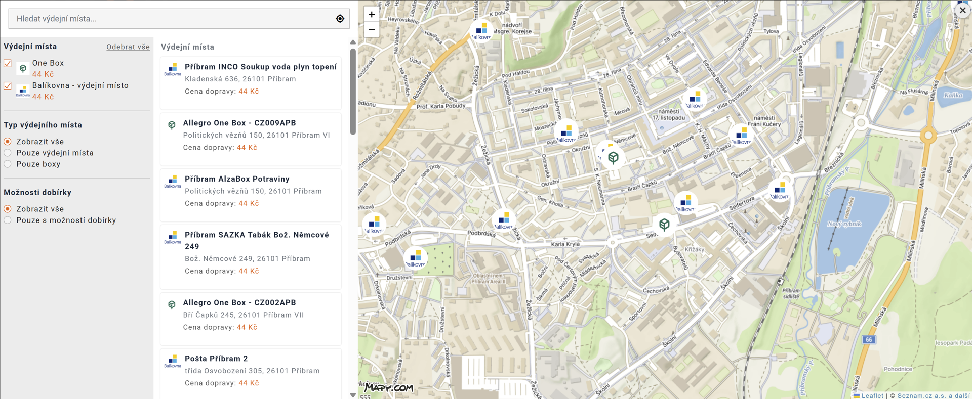 Na xzone.cz využíváme API Mapy.com pro zobrazení výdejních míst dopravců (aktuálně One a Balíkovna). Zákazníci si díky tomu mohou snadno vyhledat nejbližší výdejní místo, filtrovat preferovaného dopravce a zvolit, zda je zajímají pouze výdejní boxy, nebo i kamenná výdejní místa. Po výběru konkrétní pobočky se zobrazí její detail a po potvrzení se informace o zvoleném výdejním místě automaticky přenesou do objednávky.