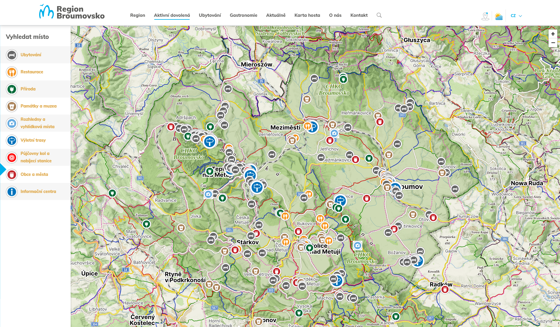 API Mapy.com využíváme k představení turistického regionu Broumovsko, zaznačení tras, výletních cílů, doprovodné turistické infrasturktury...