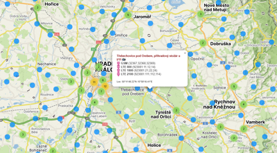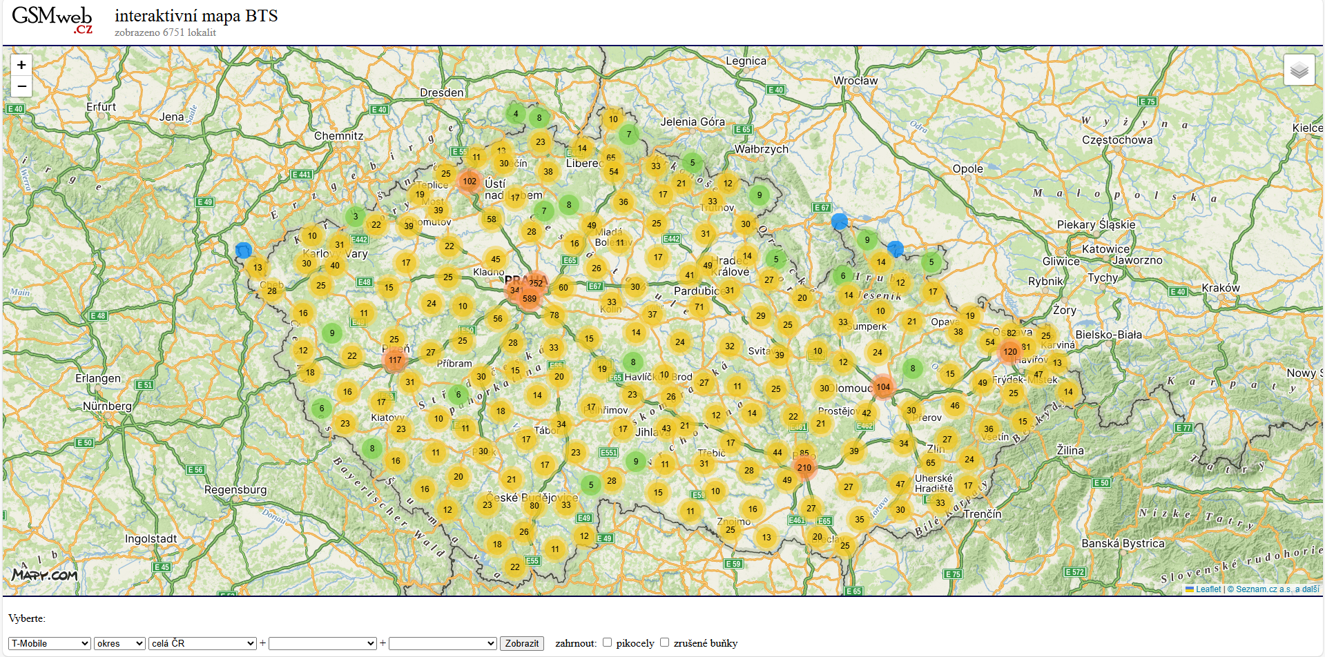 Zobrazení mapy s polohami vysílačů v Česku. mapy.cz jsme zvolili kvůli jejich bezkonkurenčně nejpřehlednějším mapovým podkladům pro Česko