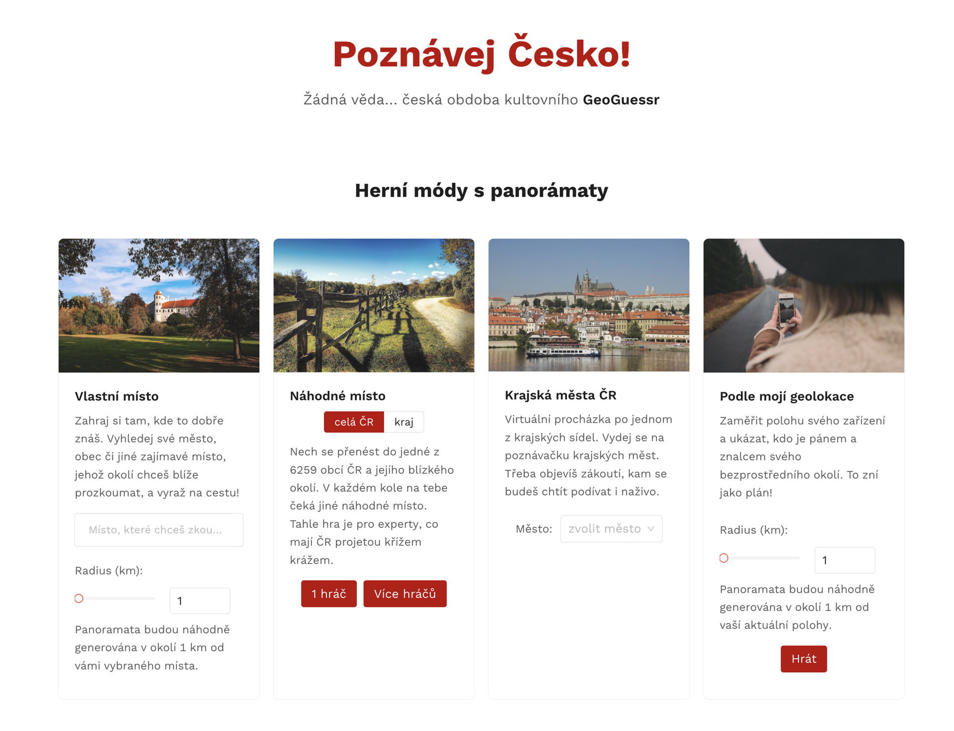 Hra využívá panoramata a mapové podklady aplikace Mapy.cz od Seznamu. Hratelnost je neomezená - jedinou hranicí je hranice České republiky 🇨🇿.