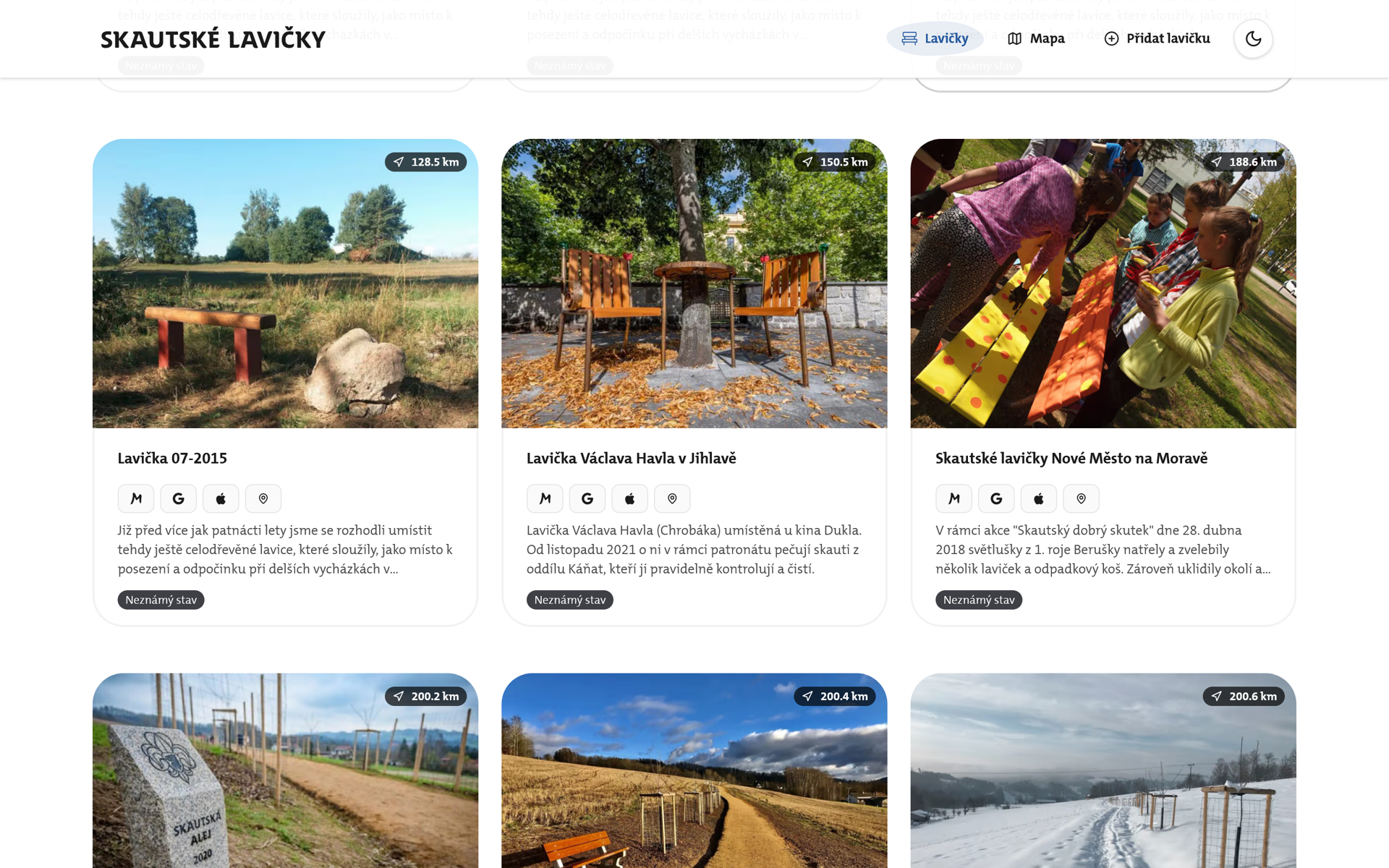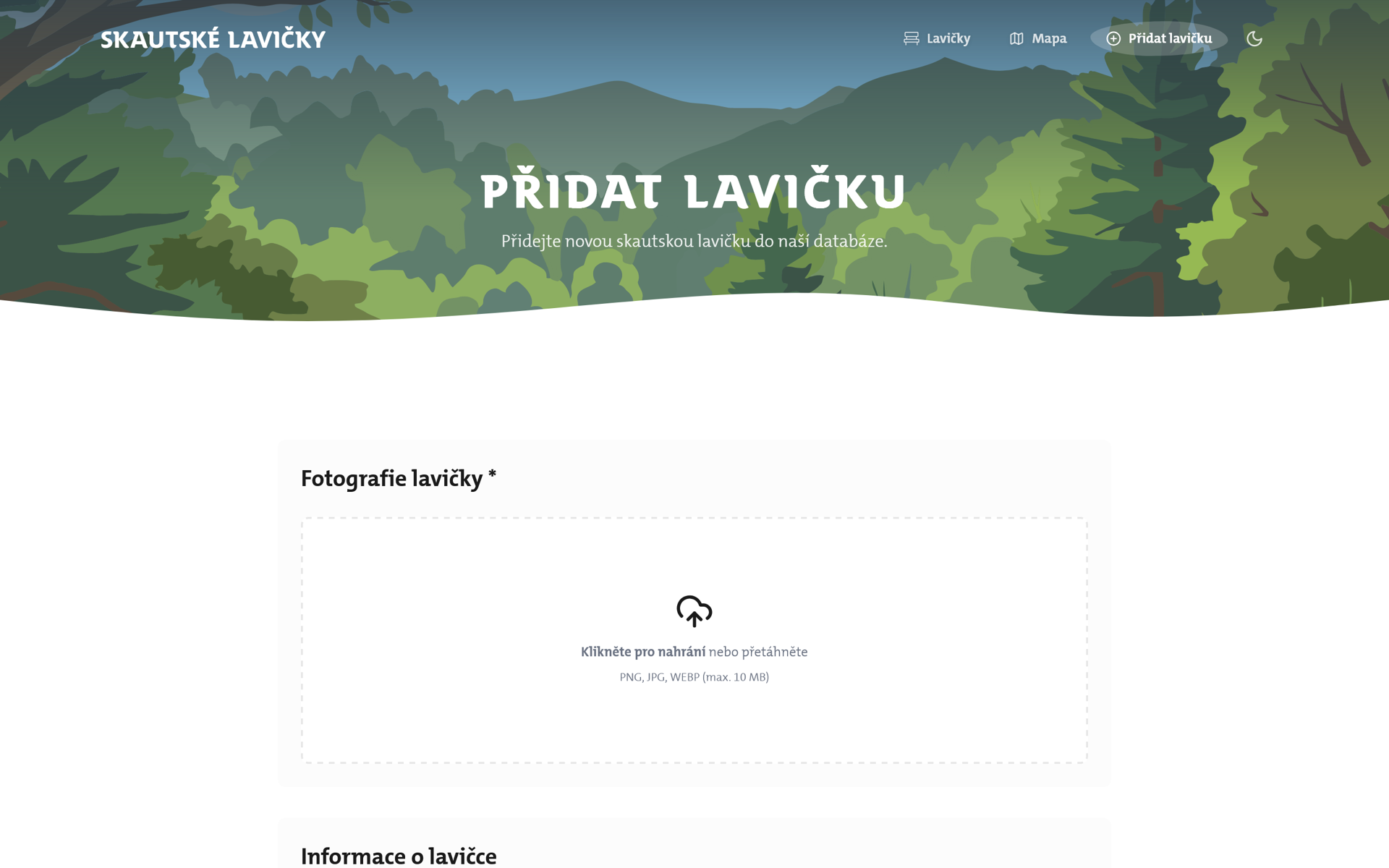 Projekt mapuje skautské lavičky - místa s duší, kde se dá zastavit a vnímat krásu světa. Nejsou to jen kusy dřeva, ale místa k setkávání i rozjímání, která skauti tvoří pro ostatní. Aplikace zobrazuje lavičky v mapě, sdílí jejich příběhy a umožňuje uživatelům přidávat polohu nových laviček.