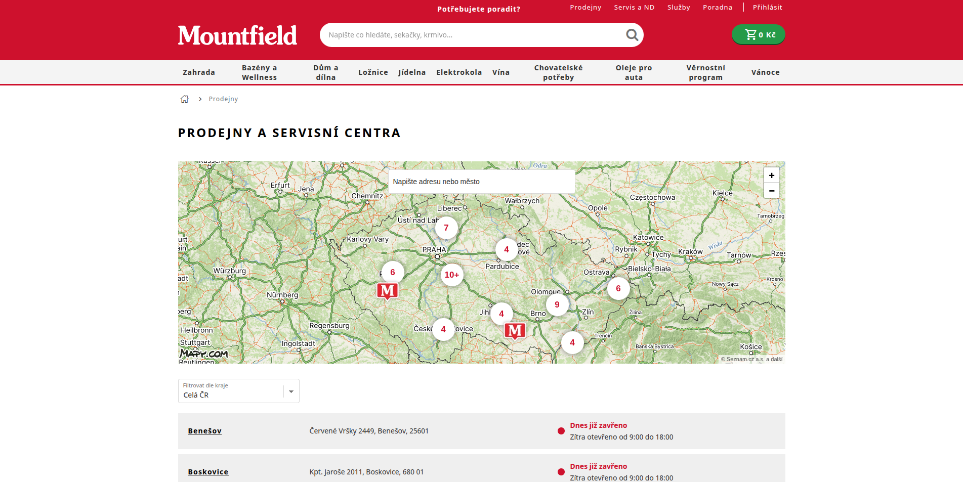 Na e-shopu www.mountfield.cz využíváme API Mapy.cz pro zobrazení našich kamenných prodejen i výdejních míst přepravců. Díky tomu mohou zákazníci snadno najít nejbližší místo pro vyzvednutí objednávky nebo si vybrat prodejnu k osobní návštěvě.