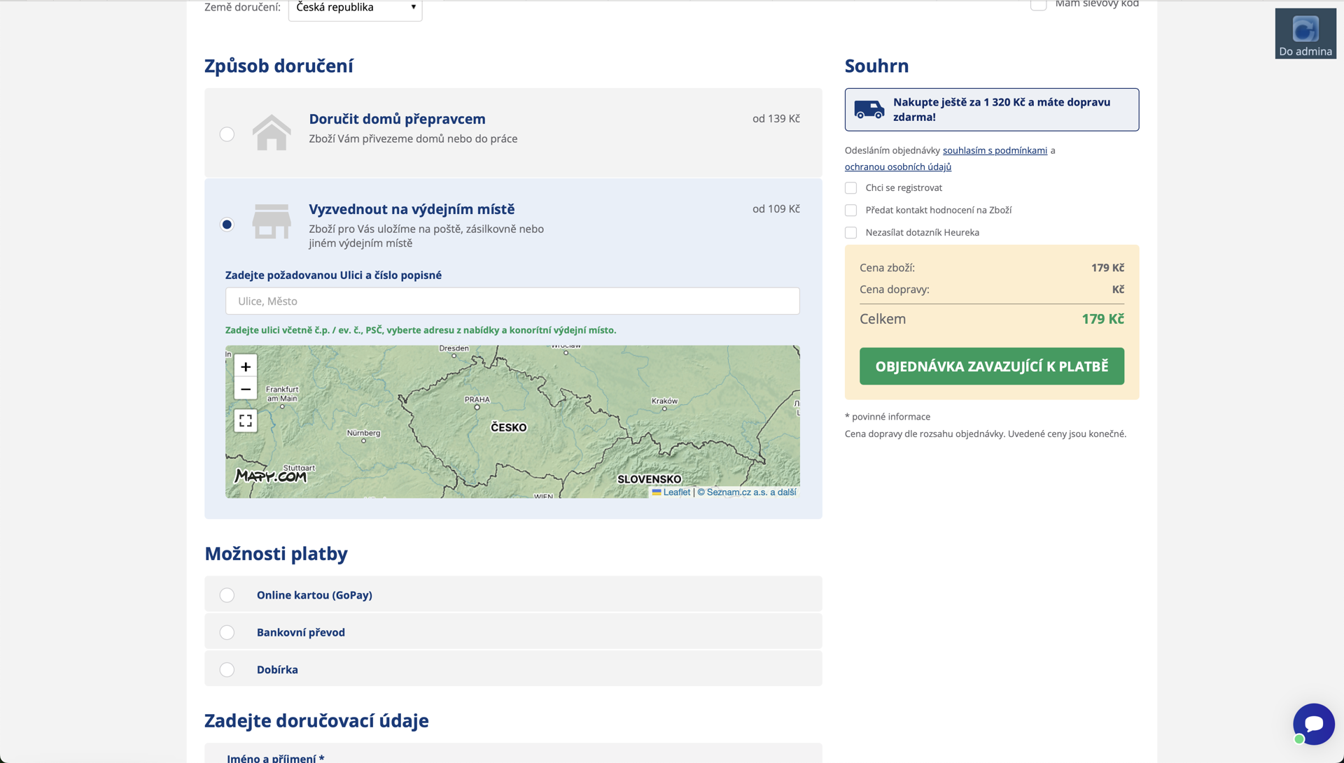 Nákupní košík pro vybrání výdejního místa (zásilkovna, gls apod.). pro vyplnění fakturační adresy a doručovací adresy.